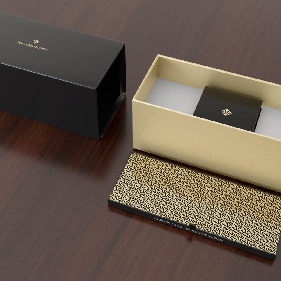 Every engagement ring and beautiful piece of Diamond Heaven jewellery will be presented in our high-quality jewellery boxes. The sleek, black lacquered jewellery box complete with our Diamond Heaven logo radiates elegance and features a black suede inlay which will make your diamonds sparkle from every angle the moment you open the box.